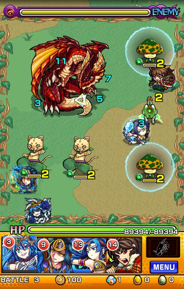 ボスは体力が低く高火力。時間をかけずに水属性モンスターで集中攻撃したい。