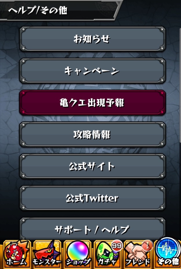 全ユーザーを4分割して、12:00〜12:29、12:30〜12:59、13:00〜13:29、13:30〜1359の何処かに割り当てている。自分の開催時間は、【その他】の亀クエ出現予報でチェックできます。簡単。