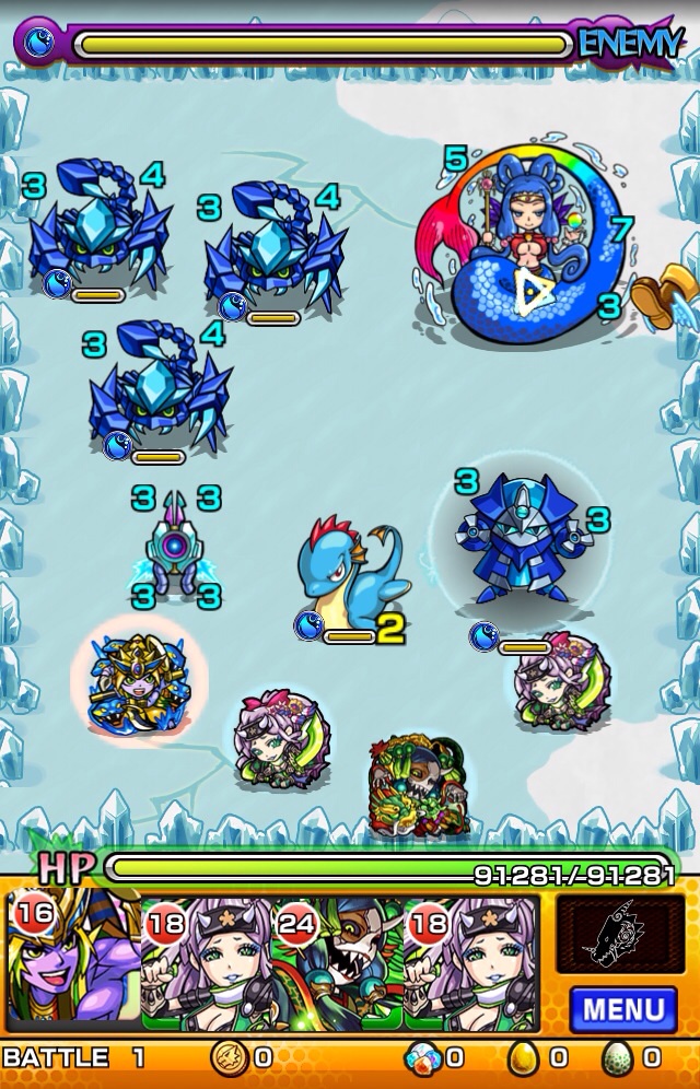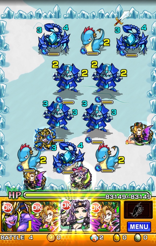サソリ集団にロボ集団。サソリはどんな攻撃も1しか当たらないので後回し。まずはロボを倒しましょう。