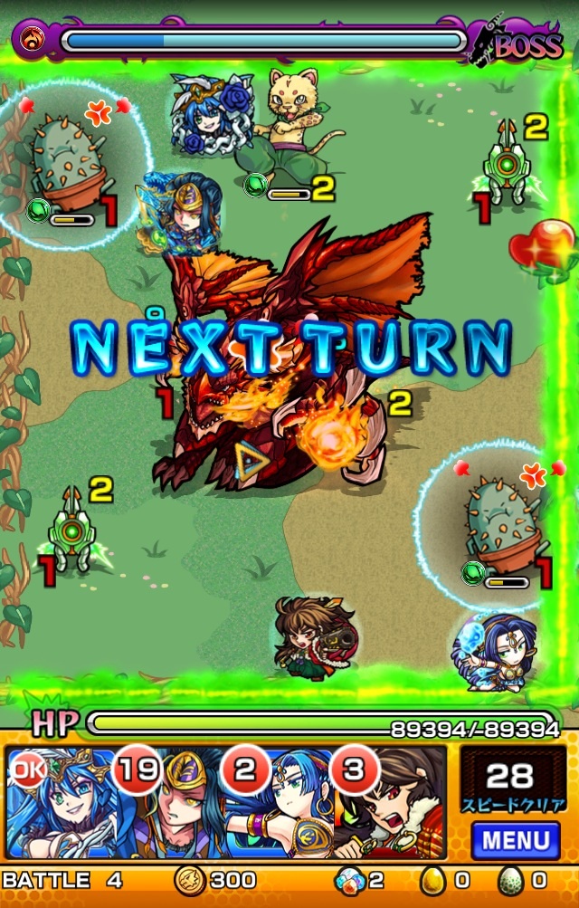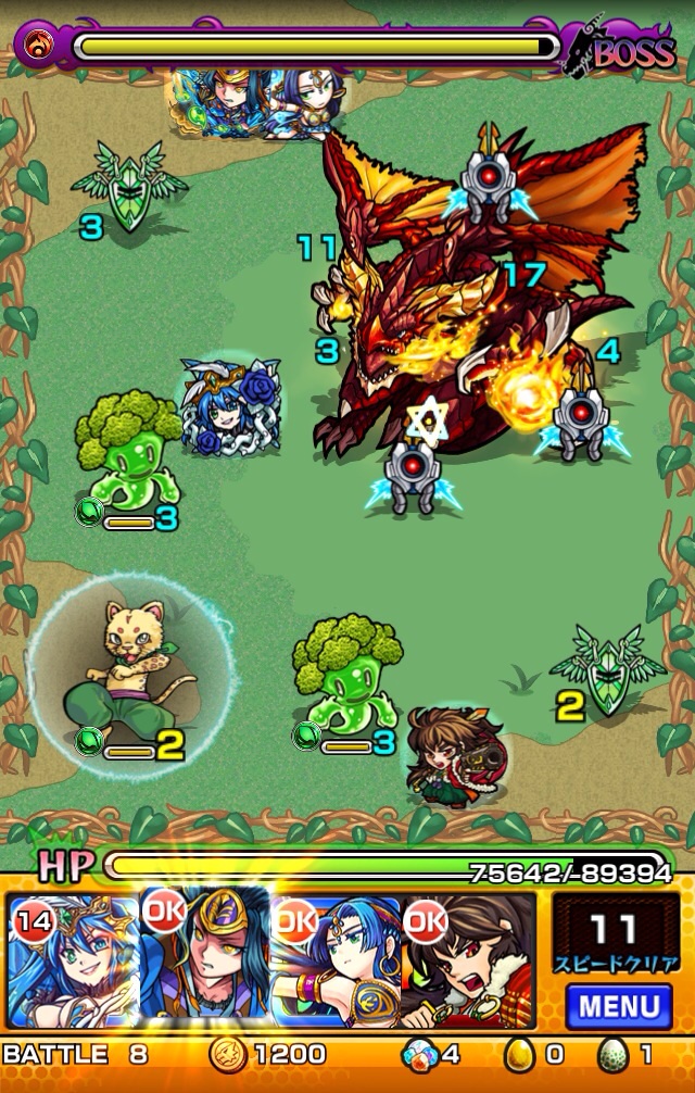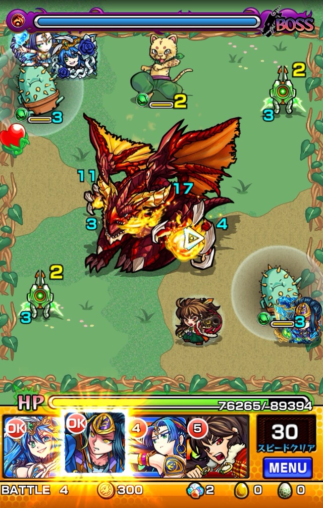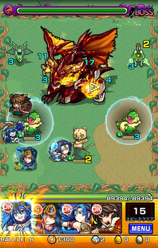 ボスは体力が低く高火力。時間をかけずに水属性モンスターで集中攻撃したい。
